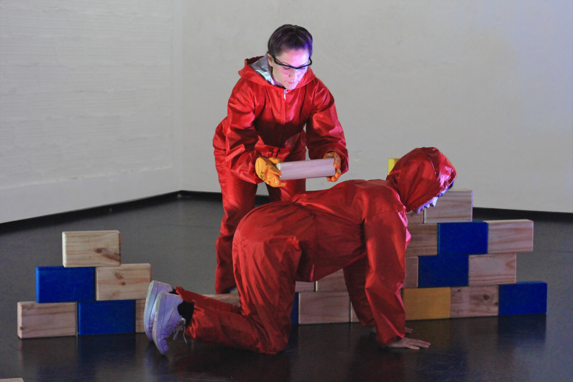 Entonces, el contacto. Dos intérpretes se abrazan. Entre ellas, una pila de ladrillos sigue sosteniéndose allí, como si insistiera en recordar la tarea. Pero ese gesto —ese gesto tan simple— modifica la escena. Los cuerpos se rozan, se desvían, se permiten otra forma de moverse. Como si en ese roce se desactivara el deber. Como si fallar no fuera perder el control, sino recuperarlo.