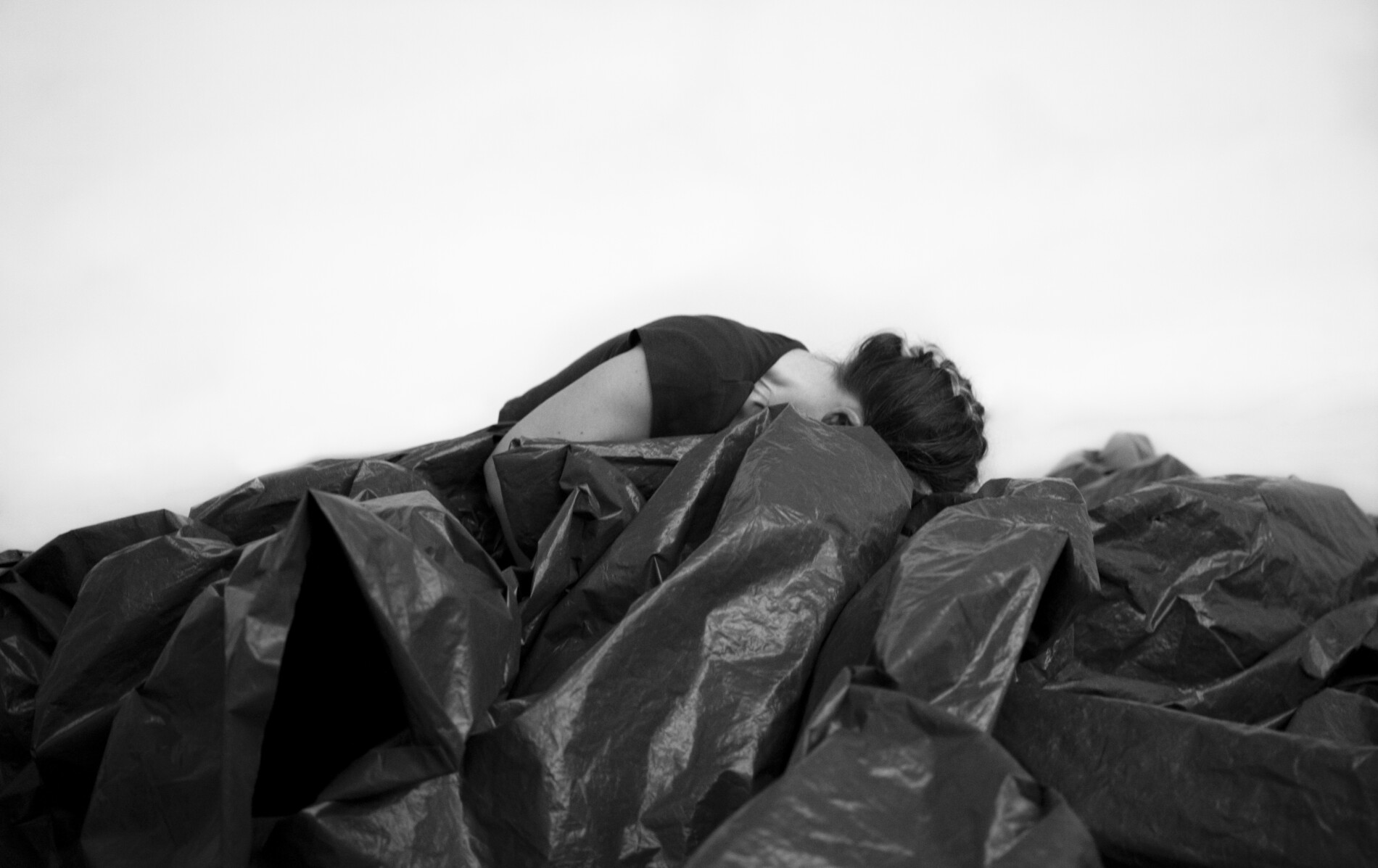 Hay un mínimo reflejo lumínico sobre el plástico, piso en el que los cuerpos quedan (con)fundidos y forman remolinos. Los colores del vestuario escalan entre el gris y el negro, e interactúan con el movimiento y el material maleable. Generan texturas de lo hondo y de aguas barrosas. Su ductilidad produce ondulaciones, elevaciones, entre el aire embolsado y los pliegues. Si algo sucede, todo se mueve. Cuando las bailarinas traen hacia sí el material sintético, el espacio se vuelve centrífugo. Al manipularlo, se produce sonoridad. En la casi completa oscuridad, intuyo una lluvia que nunca llega, un goteo de techo de PVC, una inminente caída en el sopor del verano, gruesas gotas que percuten la materia inician, se multiplican, pero nunca llega a llover.
