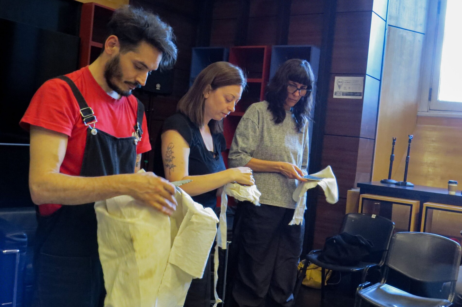 Adentro, el espacio se organiza como una especie de mapa de trabajo. A la derecha de la entrada, la pared está cubierta por fragmentos de textos y fotografías de obras anteriores de Roma, pegados directamente sobre la superficie de cemento, como si las piezas siguieran dialogando entre sí. Frente a su escritorio, una biblioteca reúne materiales de investigación y lectura. Y sobre otra de las paredes aparece algo distinto: una suerte de cronograma visual dedicado a Archivo para recuperarme. Hay anotaciones, imágenes, fechas de presentaciones, ideas en proceso. Más que una planificación cerrada, parece un archivo en movimiento, donde el libro convive con lo que ya sucedió y con lo que todavía está por venir. Todo está dispuesto con atención, pero sin rigidez: el entramado no aparece como algo terminado, sino como un proceso que sigue activo.