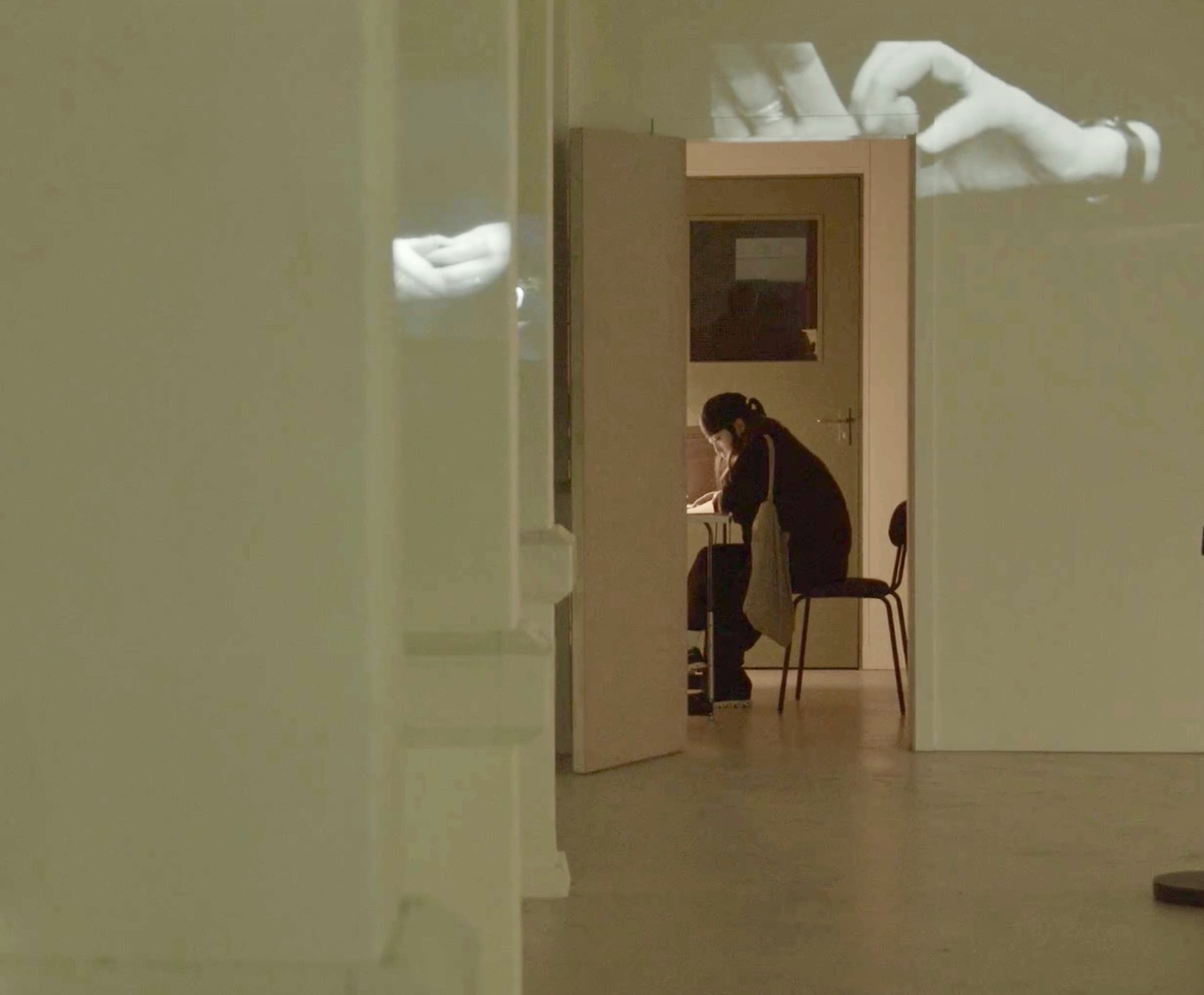 In Fig 2, just through the doorwayframed by giant hands, you can see a woman who looks like she is sitting and reading. What she is actually doing is watching a miniature version of one of my films projected onto a page of a book.