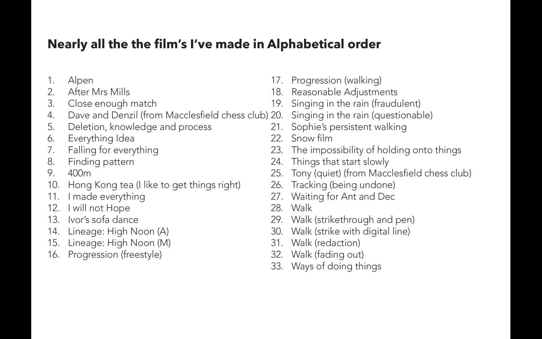I can’t remember now why the films are listed in alphabetical rather than chronological order. Why not arrange them according to when they were made? What does alphabetical ordering do here? On reflection, there is a sense of timelessness created by this ordering because it avoids a narrative progression of early, mid-career or recentlymade films.Listing the works alphabetically is a form of retrospective consolidation, but the effect is more archival than retrospective. Rather than presenting the films as part of a linear progression, the ordering produces a sense of archival simultaneity.[8] This feels appropriate because I am not aware of consciously trying to refine or develop a practice over time in the way some artists describe.[9]