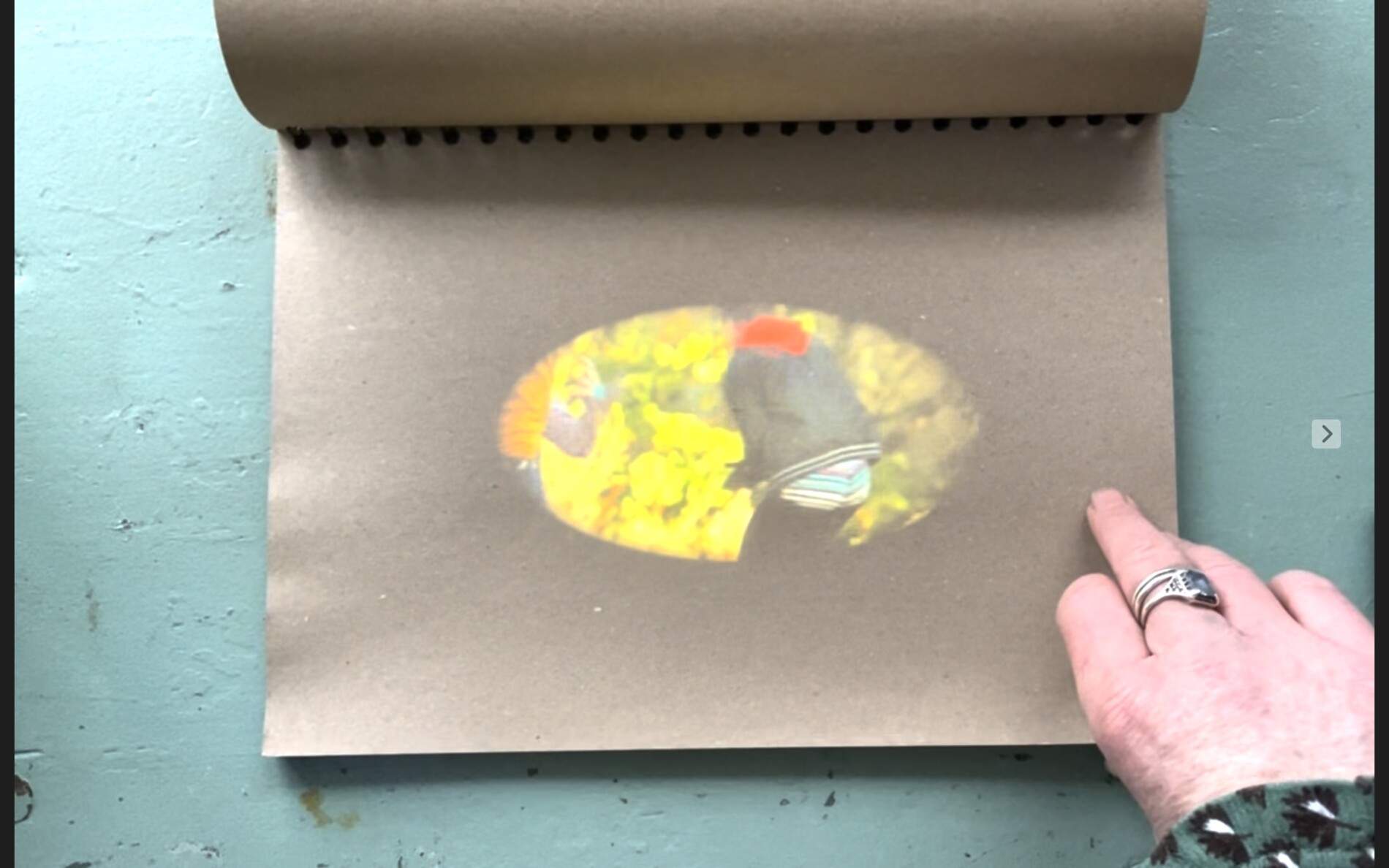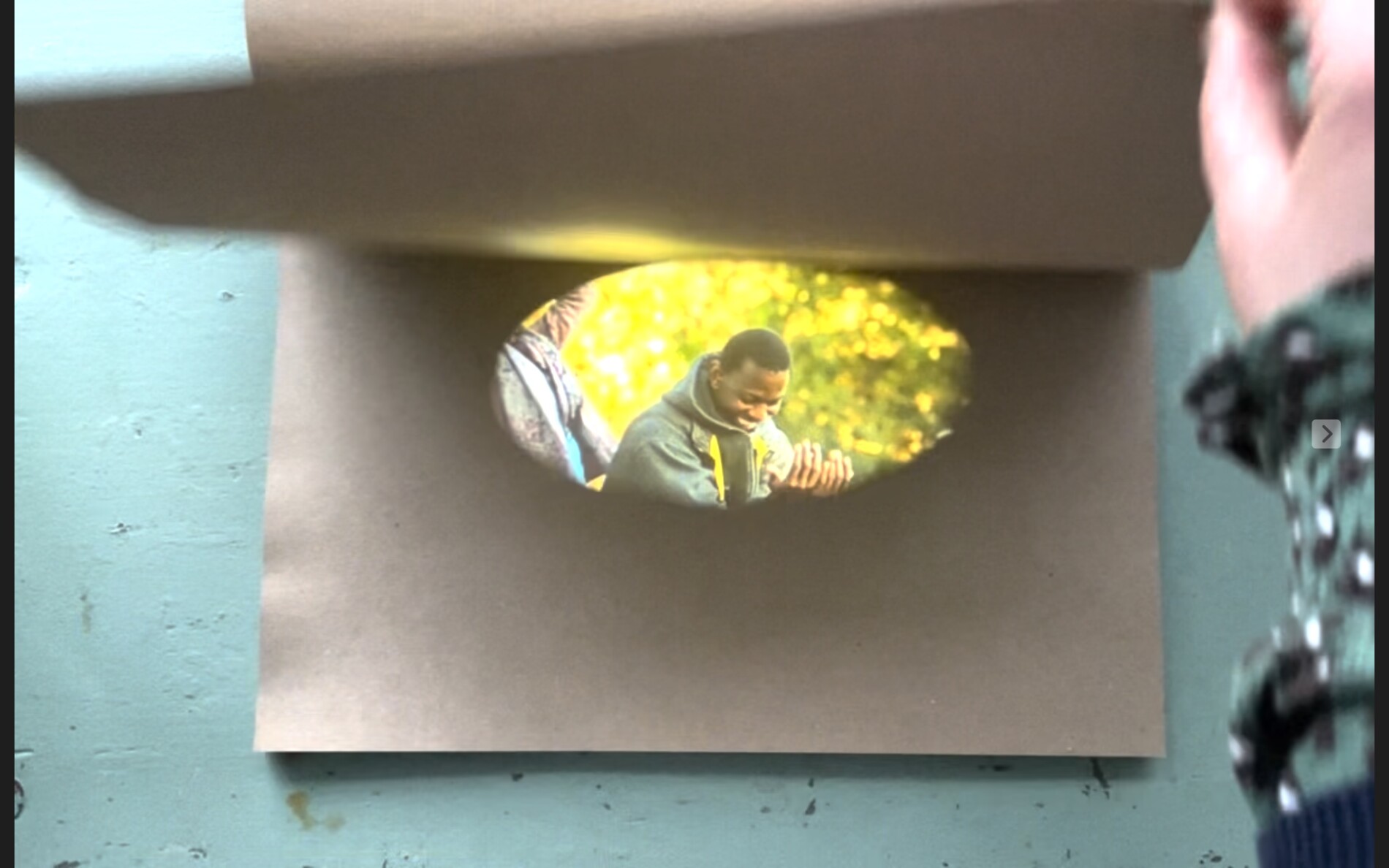 There is clearly a desire to animate analogue sensation around digital video, in this work. For as you watch the film on the page, your eye is drawn to the materials: to the process of something materialising. To watch each film the viewer must touch the materials of the page inviting a tactile, embodied moment of spectatorship. There is also an analogue feel of causality (this leads to that) as you turn the page and a film appears. As soon as the page is turned, and the camera no longer reads the marker, the film stops playing.